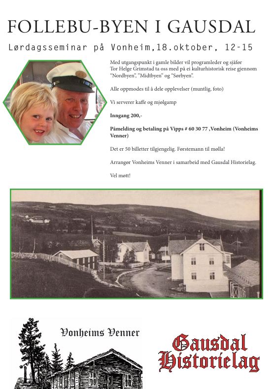 Lørdag 18. oktober inviterer Vonheims venner, i samarbeid med Gausdal Historielag, til Lørdagsseminar på Vonheim. Temaet er Follebu-byen i Gausdal, og Tor Helge Grimstad vil da ta en reise med bilder gjennom "Nordbyen" "Midtbyen" og "Sørbyen".